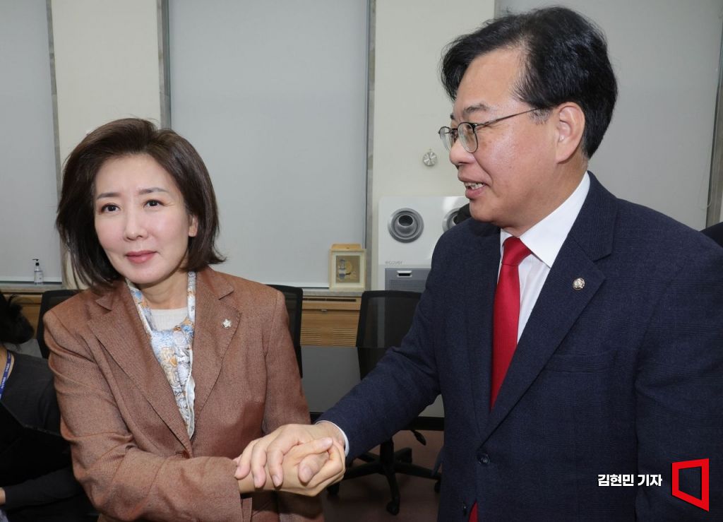 송언석 국민의힘 원내대표가 10일 서울 여의도 국회에서 현안관련 기자회견에 앞서 나경원 의원과 대화를 나눈 뒤 손을 잡고 있다.