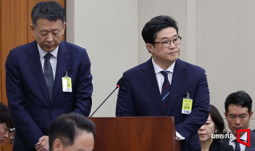김병주 MBK파트너스 회장이 지난 10월14일 국회에서 열린 공정거래위원회, 개인정보보호위원회 등에 대한 정무위원회 국정감사에서 의원 질의에 답변하고 있다. 왼쪽은 김광일 홈플러스 대표이사. 2025.10.14 김현민 기자