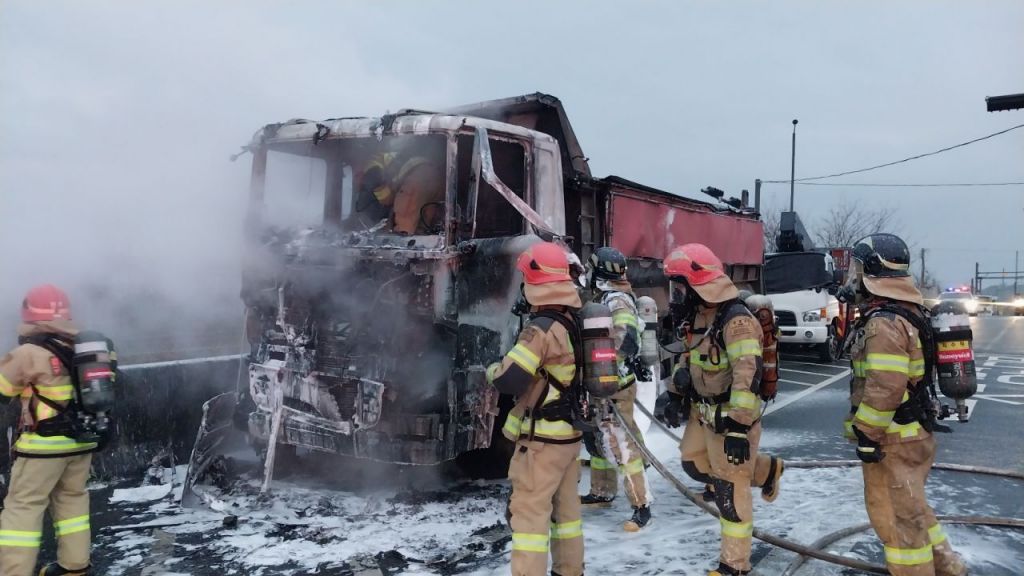 11일 오전 7시 10분께 경남 진주시 정촌면 화개리 인근 육교 갓길에 있던 25t 덤프트럭에서 불이 났다.