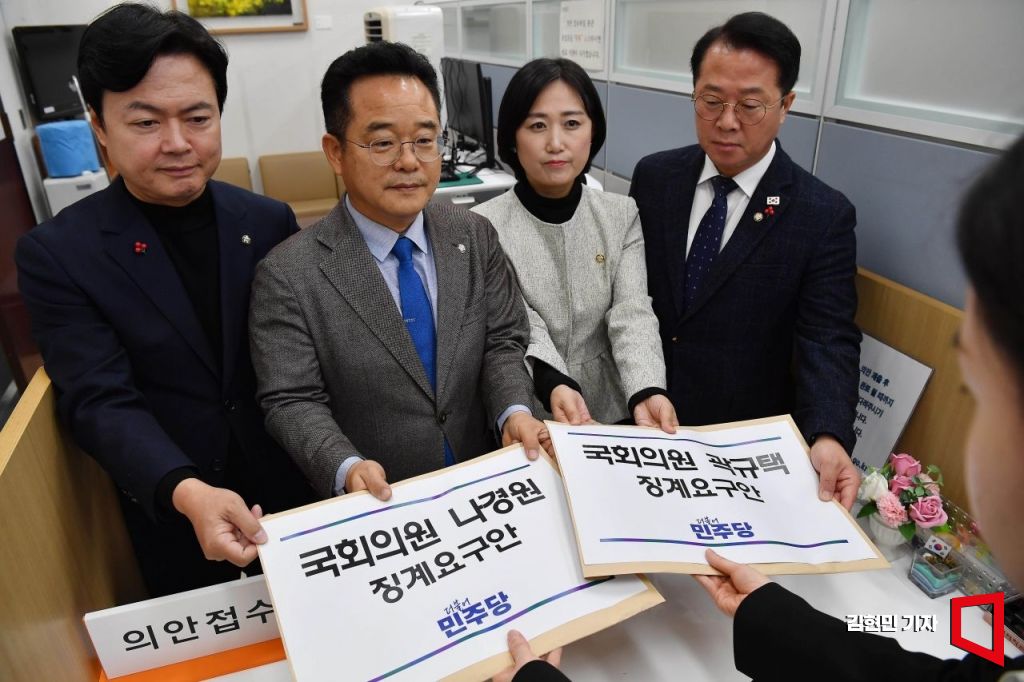 더불어민주당 김현정(왼쪽부터), 민병덕, 백승아, 문금주 의원이 11일 국회 의안과에 국민의힘 나경원, 곽규택 의원에 대한 징계 요구안을 제출하고 있다.