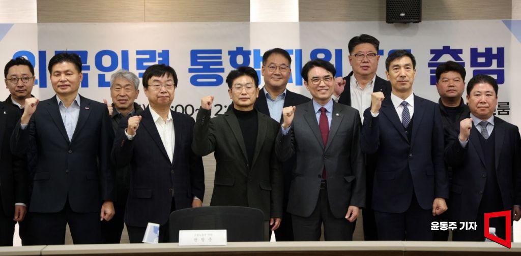 권창준 고용노동부 차관(아래줄 오른쪽 3번째)이 12일 서울 중구 서울고용노동청에서 열린 '외국인인력 통합지원 TF 출범식에 참석, 참석자들과 기념촬영을 하고 있다.