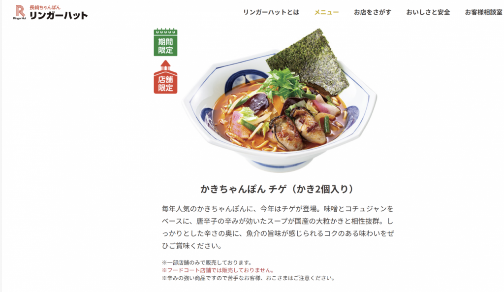 신기한 점은 이 링거헛에서 매년 인기를 끄는 메뉴가 '굴 짬뽕'이라는 것입니다. 우리나라 겨울 중화요리점 특선 메뉴랑도 일치하는데요. 심지어 이번에는 점포·계절 한정 메뉴로 '굴 짬뽕 찌개'라는 메뉴도 계절 한정으로 선보인 바 있습니다. 메뉴 설명에도 굴이랑 고추장, 된장을 넣어 찌개로 만들었다고 돼 있었는데요.