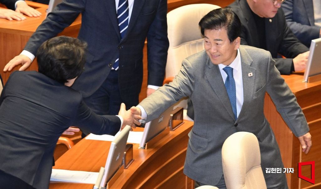 정동영 통일부 장관이 12일 서울 여의도 국회에서 열린 12월 임시국회 본회의에 출석해 형사소송법 개정법률안의 무제한 토론 중단의 건에 대한 투표를 한 뒤 여당 의원들과 인사하고 있다.