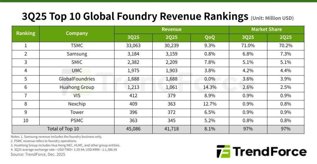 업체별로 TSMC는 올해 3분기 330억6300만달러의 매출을 올리며 시장 점유율 71%를 차지했다. 전 분기보다 0.8%포인트 늘어난 수치다.