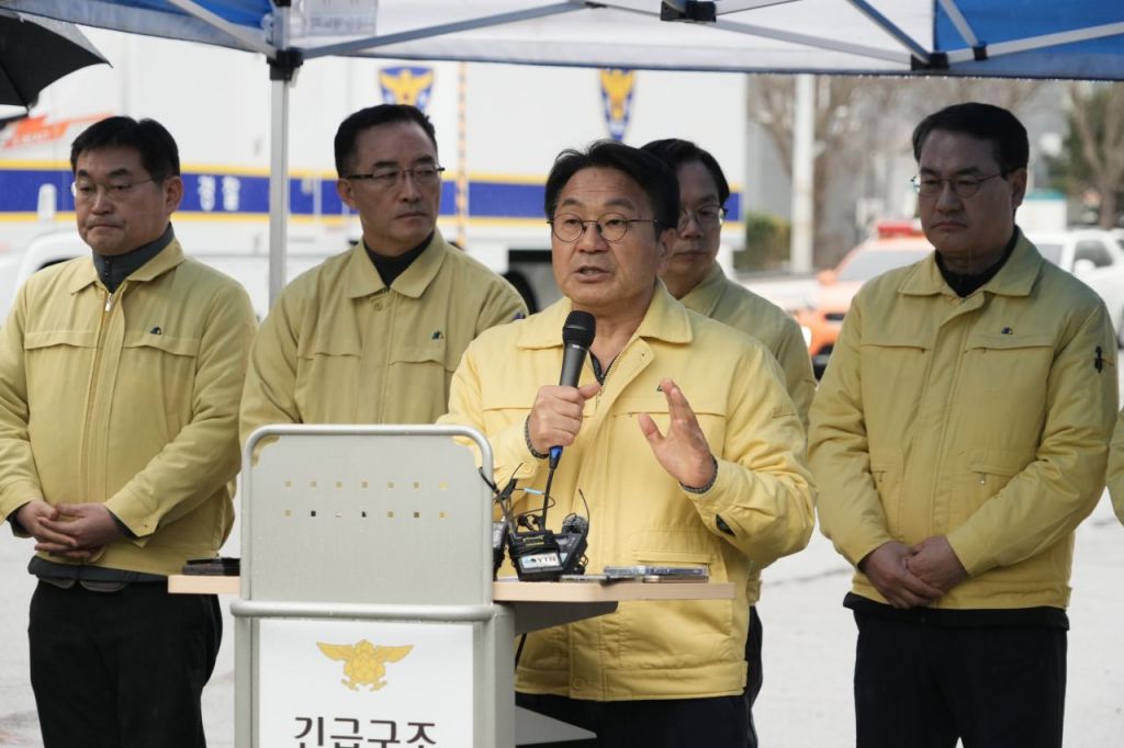 광주대표도서관 붕괴 사고 사흘째인 13일 강기정 광주시장이 광주 서구 치평동 사고 현장을 찾아 취재진에게 사고 후속 대책을 발표하고 있다. 광주시 제공