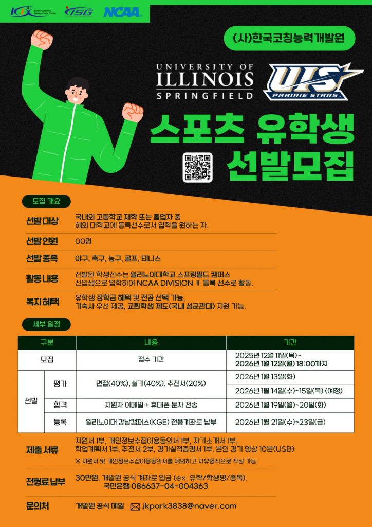 ㈔한국코칭능력개발원(KCDC)이 미국 일리노이대학교 스프링필드(University of Illinois Springfield, UIS)와 협력해 스포츠 유학생을 선발한다.