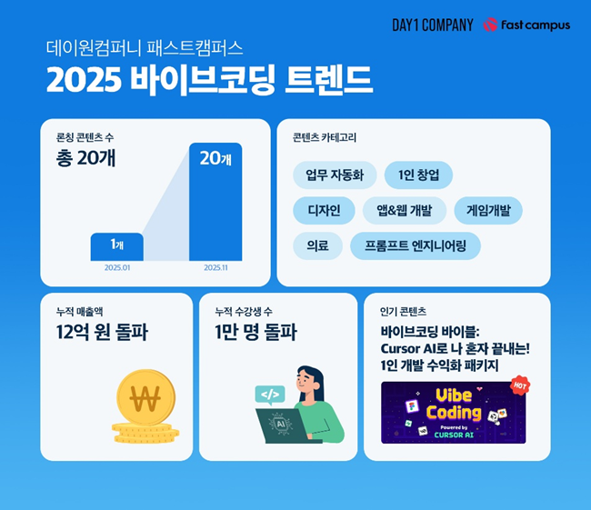 패스트캠퍼스는 올해 1월 바이브코딩 교육을 선보인 이후 연말 기준 총 20개의 콘텐츠 라인업을 구축하고 누적 매출 12억 원, 누적 수강생 1만 명을 돌파했다. 가장 높은 매출을 기록한 콘텐츠는 '바이브코딩 바이블: Cursor AI로 나 혼자 끝내는! 1인 개발 수익화 패키지'였다.