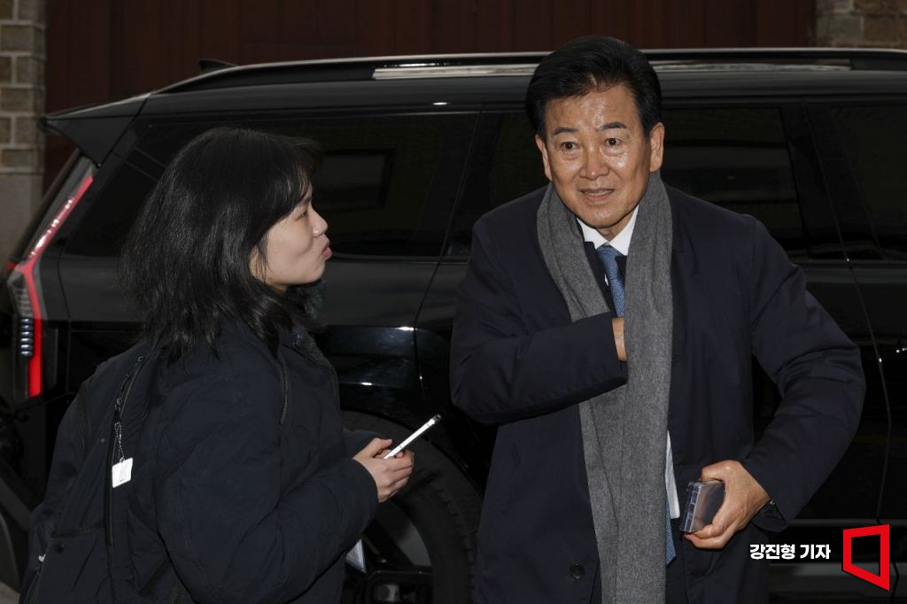 정동영 통일부 장관이 15일 서울 중구 달개비에서 열린 '남북관계발전위원회 민간위원 간담회'에 참석하며 취재진에게 질문 받고 있다.