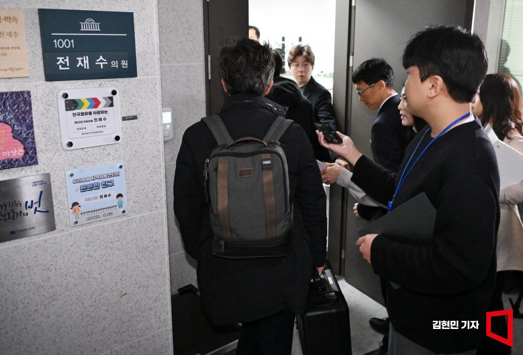 경찰이 정치권 인사들의 통일교 금품 수수 의혹과 관련해 첫 강제수사에 착수한 15일 국회 의원회관 내 전재수 전 해양수산부 장관 사무실로 경찰 관계자들이 들어가고 있다.