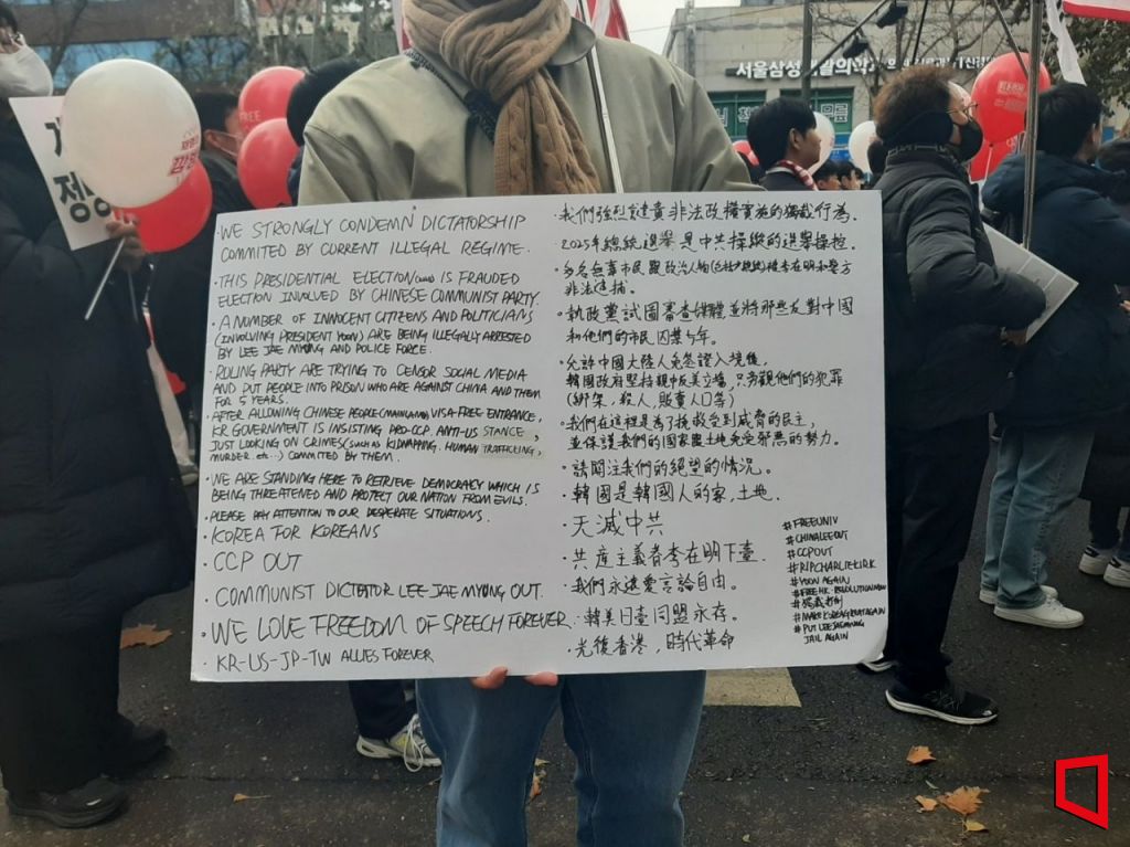 지난 6일 동대문 거리에서 대학생 보수단체인 자유대학이 주최한 계엄 찬성 집회에 참석한 한 대학생이 영어와 중국어로 된 팻말을 들고 있다. 임주형기자