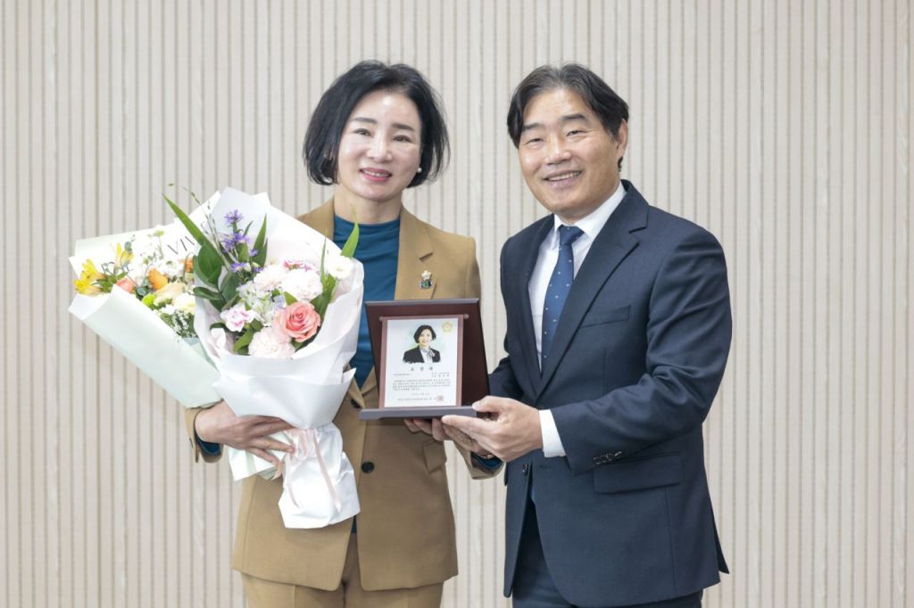 구리시의회 양경애 의원이 15일 연천군 임진강 자연센터에서 경기도북부시군의장협의회 주최로 열린 '제11회 의정활동 우수의원 표창수여식'에서 '지역경제활성화부문' 표창을 수상하고 있다. 구리시의회 제공
