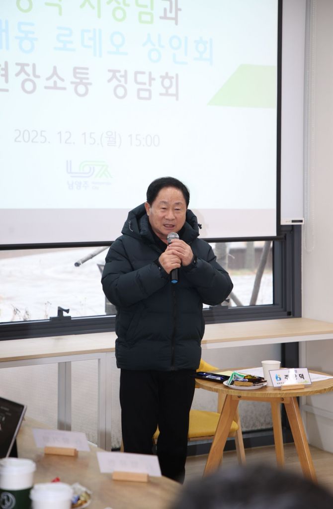 주광덕 남양주시장이 15일 별내동 작은도서관에서 로데오거리 상인회와 지역 문제 소통을 위한 정담회에서 인사말을 하고 있다. 남양주시 제공