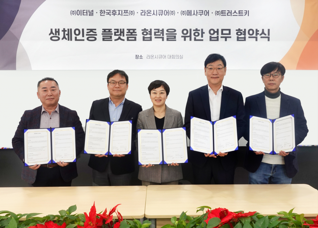 IT 보안·인증 플랫폼 기업 라온시큐어(대표 이순형, 이정아)는 한국후지쯔, 메사쿠어컴퍼니, 이터널, 트러스트키 등 4개 기업과 각각 생체인증 플랫폼 협력을 위한 전략적 제휴(MOU)를 체결했다.