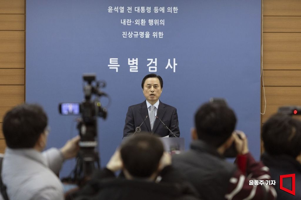 조은석 특검이 15일 서울 서초구 서울고검에서 윤석열 전 대통령의 비상계엄 선포 동기와 최초 준비 시점 등을 포함한 수사 결과를 발표하고 있다.