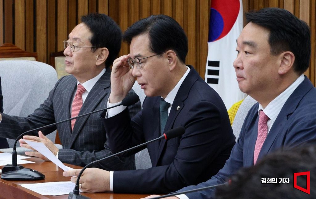 송언석 국민의힘 원내대표가 16일 국회에서 열린 원내대책회의에서 발언하고 있다.
