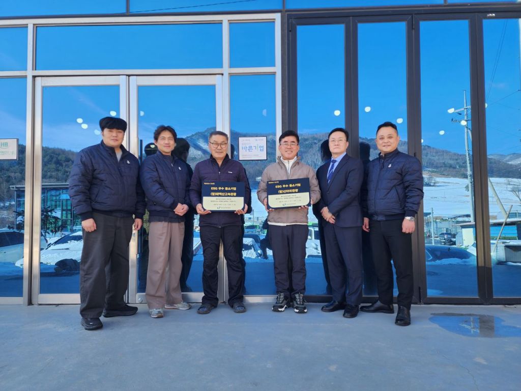 협력사 ESG 지원사업을 통해 ESG 우수 중소기업으로 선정된 태백산고속관광, 산아리관광 등 강원랜드 협력사 관계자들이 현판식에서 기념촬영하고 있다. 강원랜드 제공