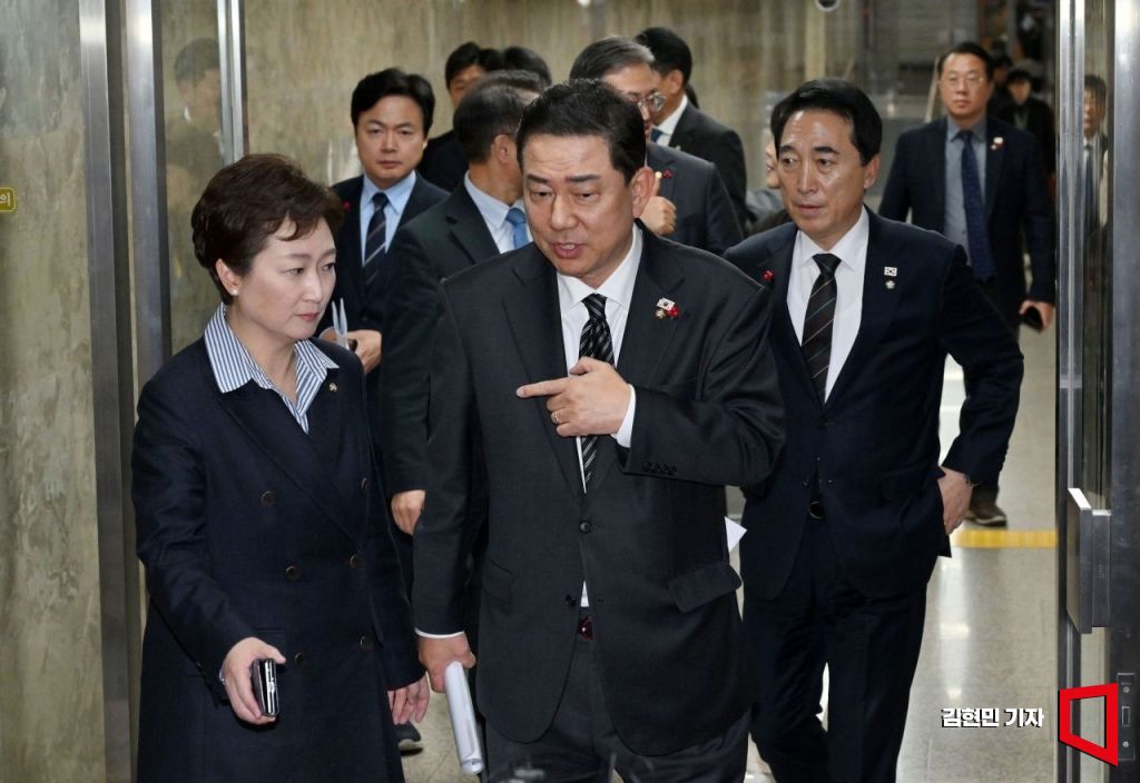 김병기 더불어민주당 원내대표와 이언주 최고위원이 16일 국회에서 열린 의원총회를 마친 뒤 이동하고 있다.
