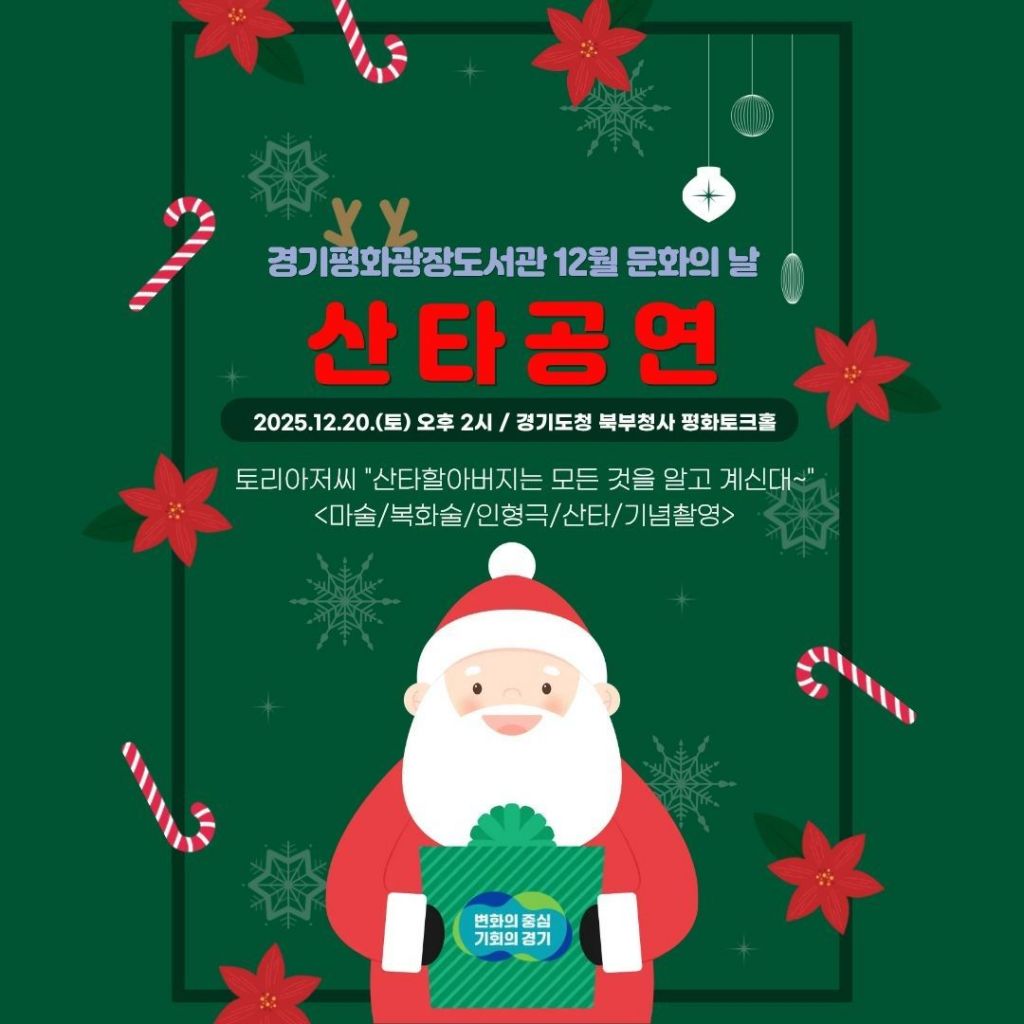 경기도는 오는 19일과 20일 이틀간 도 북부청사 평화토크홀에서 '모두가 함께하는 겨울 감성 공연-함께 읽고, 함께 웃는 하루'를 주제로 경기평화광장도서관 12월 문화의 날 행사를 연다.