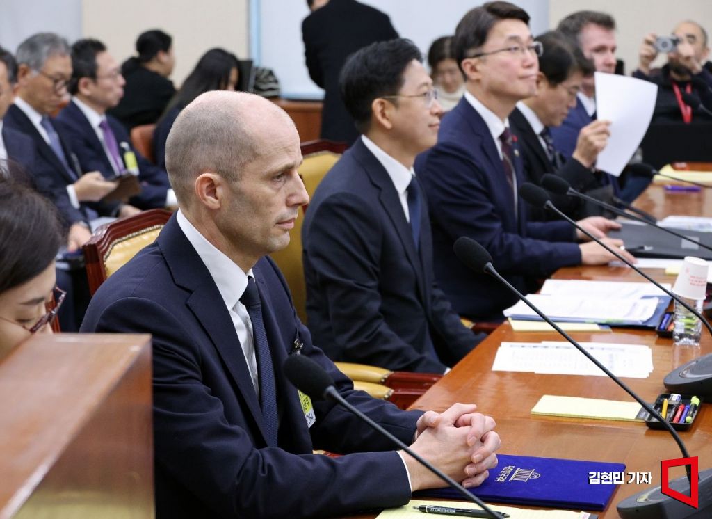 17일 국회 과방위에서 열린 쿠팡청문회에 증인으로 출석한 해롤드 로저스 쿠팡 신임 대표가 청문회장에 입장, 자리로 앉아 청문회 시작을 기다리고 있다. 2025. 12. 17 김현민 기자