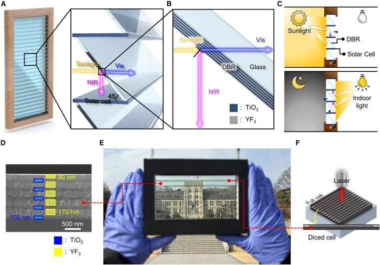 연구팀은 이러한 문제를 해결하기 위해 분산 브래그 반사경(DBR)과 양면수광형 실리콘 태양전지를 결합한 새로운 구조를 설계했다. 이 구조는 사람의 눈에 보이는 가시광선은 그대로 통과시키고, 눈에 보이지 않는 근적외선만 선택적으로 반사해 태양전지로 보내는 방식이다. 이를 통해 창문과 유사한 밝기를 유지하면서도 발전 효율을 동시에 끌어올렸다.