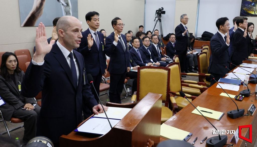 해롤드 로저스 쿠팡 신임 대표 등 증인들이 17일 국회 과학기술정보방송통신위원회에서 열린 쿠팡 침해사고 관련 청문회에서 선서하고 있다.