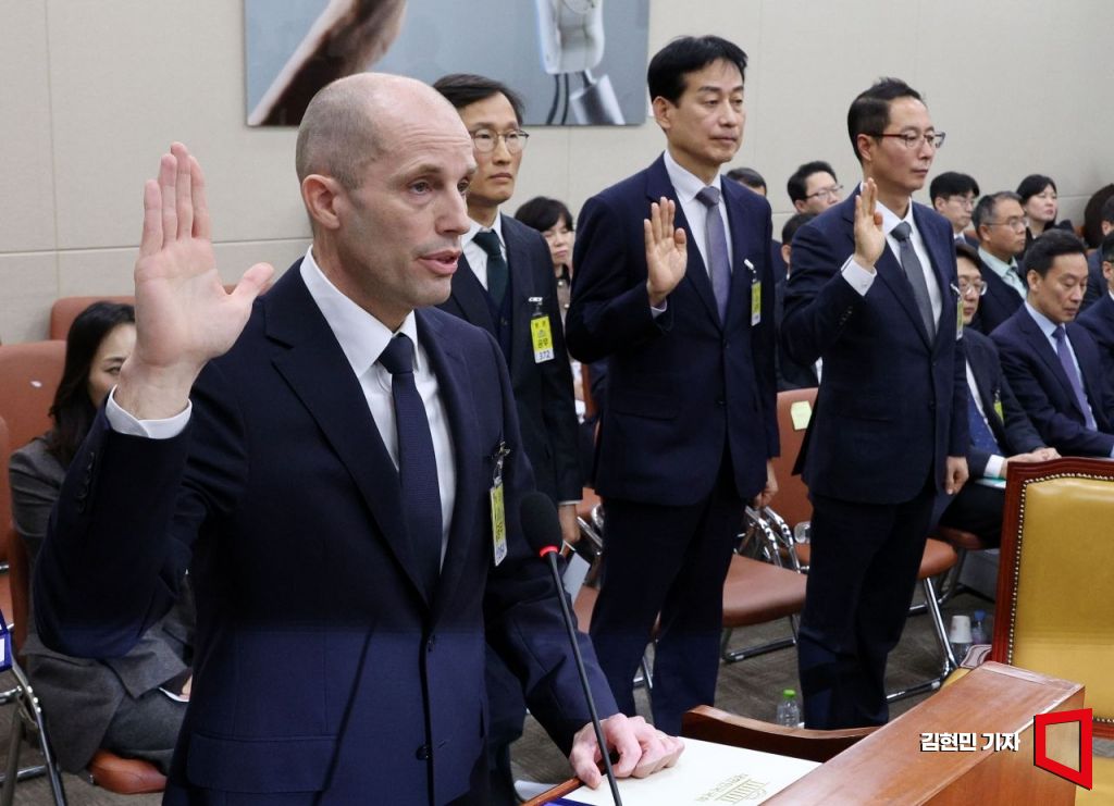 해롤드 로저스 쿠팡 신임 대표 등 증인들이 17일 국회 과학기술정보방송통신위원회에서 열린 쿠팡 침해사고 관련 청문회에서 선서하고 있다.