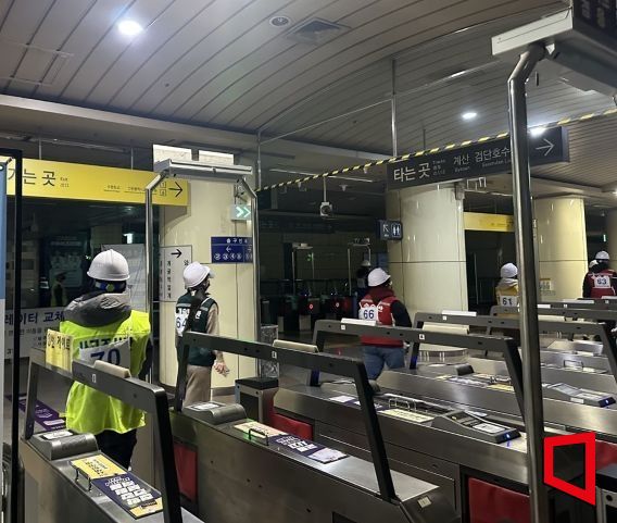 인공지능(AI) 기반 피난 안내 시스템을 검증하는 모의훈련이 17일 인천지하철 1호선 경인교대입구역에서 진행되고 있다. 인천시