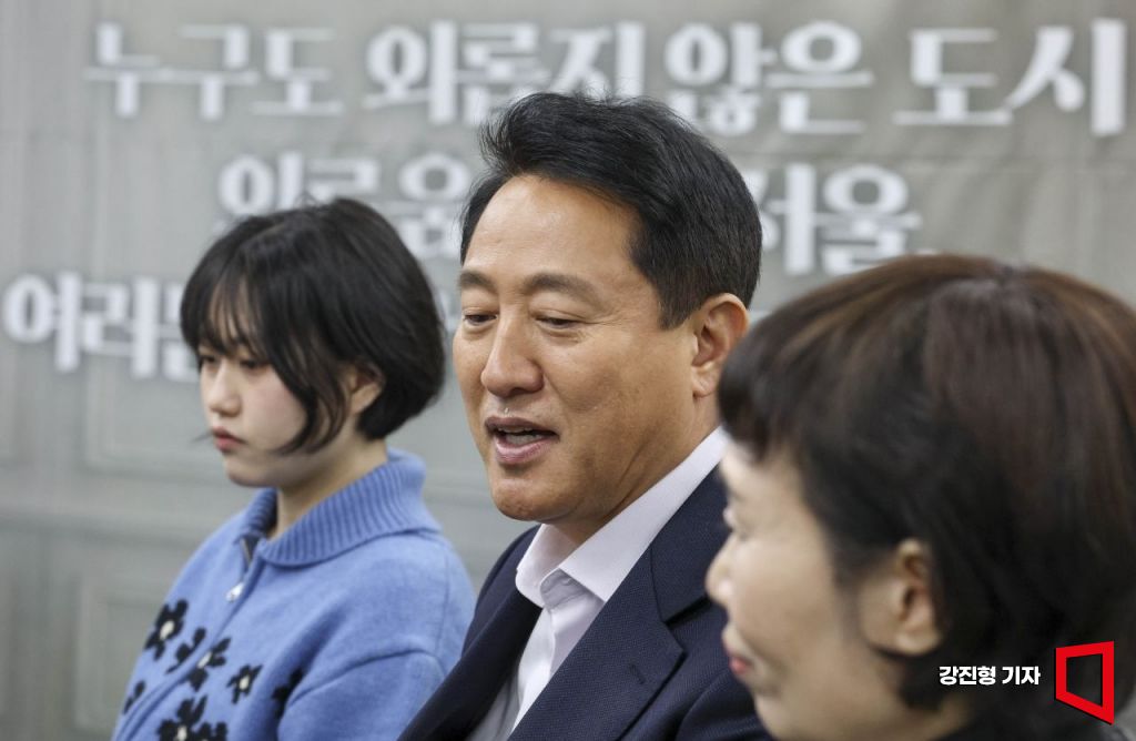 오세훈 서울시장이 17일 서울 관악구 서울마음편의점 관악점에서 열린 '외로움 없는 서울 1주년 기념 현장 소통간담회'에서 참석자들과 의견을 나누고 있다.