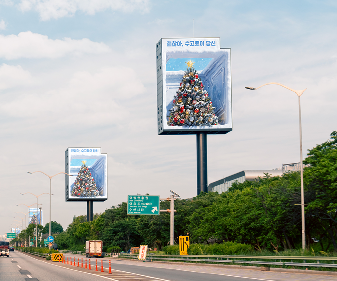 지난 16일 시작된 이번 캠페인은 오는 25일 성탄절까지 이어진다. 올림픽대로변에 설치된 6개의 초대형 디지털 옥외광고물을 통해 화려하면서도 포근한 크리스마스 트리 콘텐츠가 송출되는 방식이다. 한 해를 마무리하는 시기, 바쁜 일상에 치인 시민들이 잠시나마 기분 좋은 여운을 느낄 수 있도록 기획됐다.