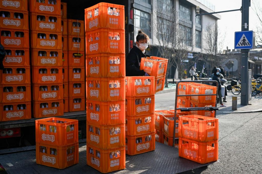 지난 11일 중국 베이징의 한 거리에서 작업자가 트럭에 음료 상자를 싣고 있다. AFP연합뉴스