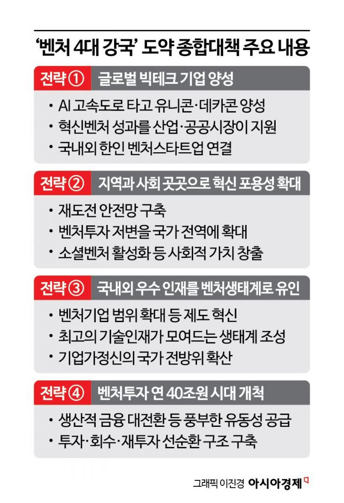 한국벤처캐피탈협회(VC협회), 벤처기업협회, 한국여성벤처협회, 초기투자액셀러레이터협회, 코리아스타트업포럼 등 혁신벤처단체협의회는 18일 정부가 발표한 '벤처 4대 강국 도약 종합대책'과 관련해 환영의 뜻을 밝혔다.