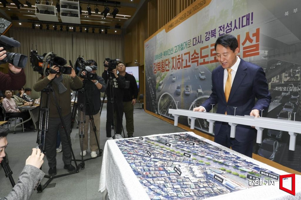 오세훈 서울시장이 18일 서울 중구 서울시청 대회의실에서 내부순환로·북부간선도로 지하화 구상에 대해 설명을 마친 뒤 고가를 철거하는 퍼포먼스를 펼치고 있다.