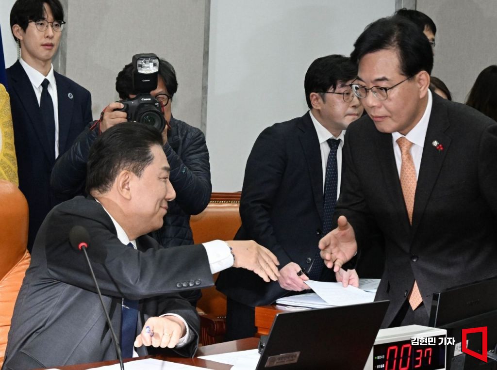 김병기 국회 운영위원장과 송언석 국민의힘 원내대표가 18일 국회에서 열린 운영위원회 전체회의에서 악수하고 있다. 이날 운영위에서는 정치개혁 특별위원회 구성결의안을 의결했다.