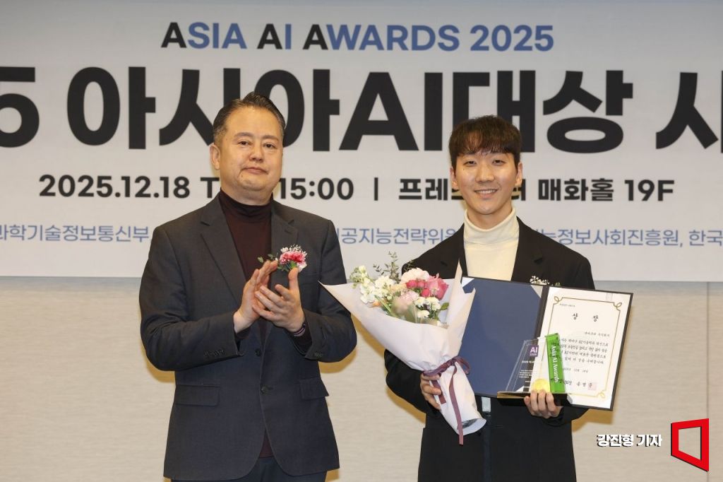 내이루리가 18일 서울 중구 프레스센터 매화홀에서 열린 '제3회 아시아AI대상 시상식'에서 벤처기업협회장상을 수상하고 있다. 2025.12.18 강진형 기자