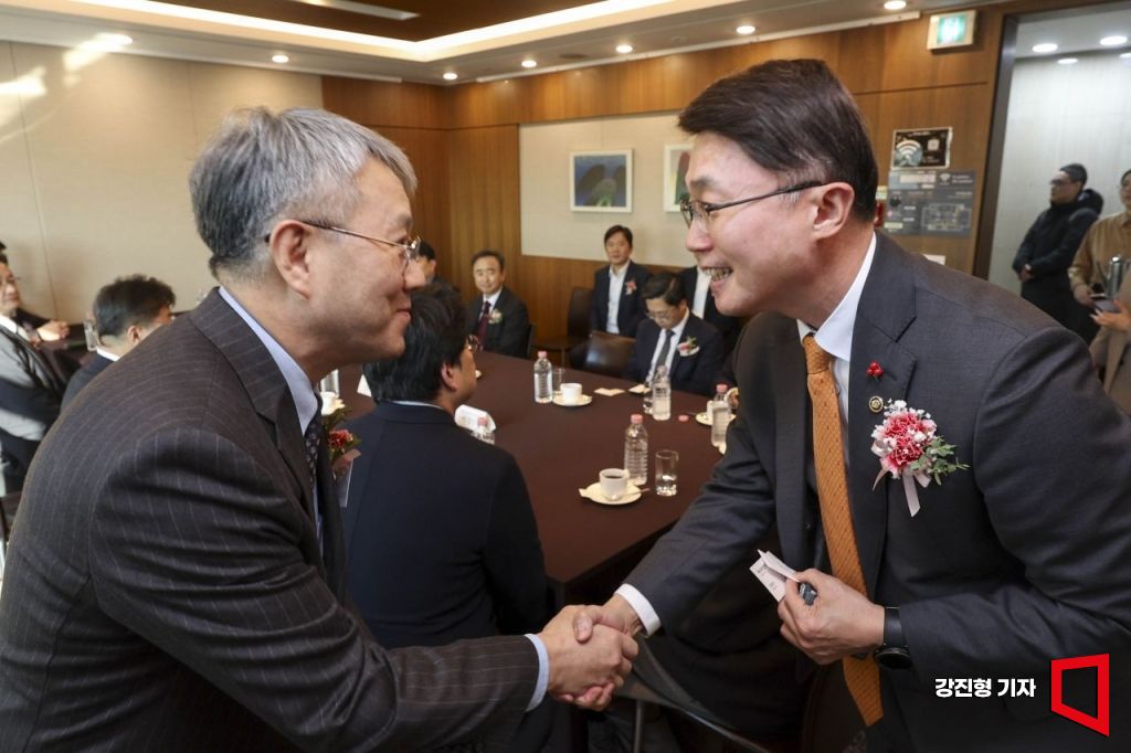 장범식 아시아경제 대표와 류제명 과학기술정보통신부 제2차관이 18일 서울 중구 프레스센터 매화홀에서 열린 '제3회 아시아AI대상 시상식'에 참석해 악수하고 있다.
