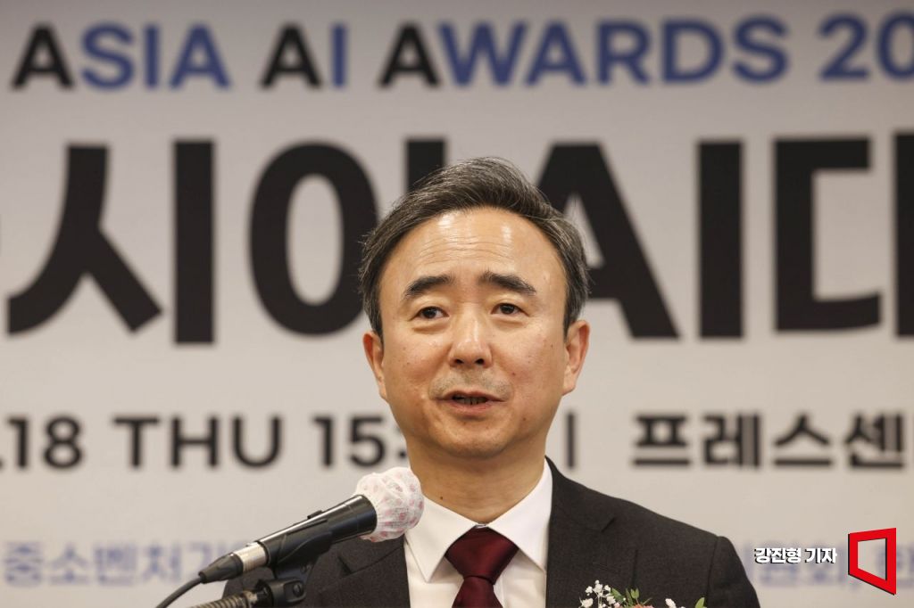 임문영 국가인공지능전략위원회 부위원장이 18일 서울 중구 프레스센터 매화홀에서 열린 '제3회 아시아AI대상 시상식'에 참석해 축사 하고 있다.