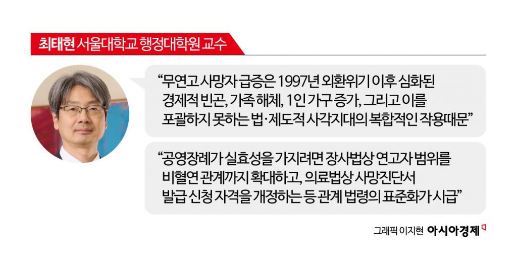 ◆최태현= 한국 사회의 오래된 변화가 비로소 가시적인 증상으로 나타나고 있는 것이다. 1997년 외환위기 이후 심화하고 있는 경제적 빈곤 문제, 가족 해체 현상과 증가하는 1인 가구와 독거노인, 그리고 이를 포괄하지 못하는 법·제도적 사각지대가 복합적으로 작용하고 있다. 아울러 최근 들어 한국 사회가 비로소 무연고 사망자에 관심을 기울이면서 그 규모가 보다 가시화된 측면도 있다고 생각된다.