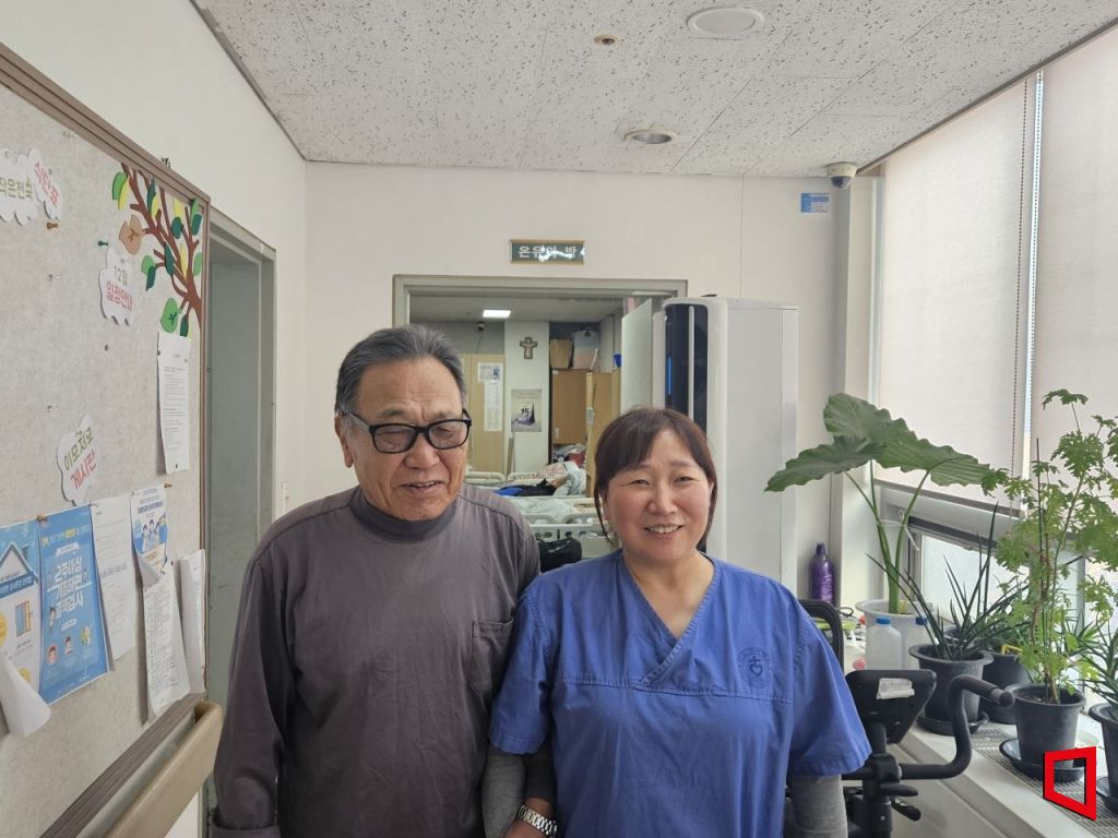 군무원 출신인 민씨는 2015년 입소 후 약 10년간 이곳에서 지내고 있다. 가족으로 아내와 동생이 있지만, 연락이 끊긴 지 오래다. 민씨는 한 달 전 담석이 생겨 서울의료원에서 입원 치료를 받다 이날 복귀했다. 그는 "간호사님과 복지사님 모두 입원한 사람들 기저귀 갈아주는 일을 힘든 내색도 없이 해내고 웃으면서 말도 잘 걸어주는 모습을 보고 천사라고 생각한다"며 "나보다 나이도 한참 어리지만 그런 모습을 보면 존댓말을 할 수밖에 없다"고 말했다.