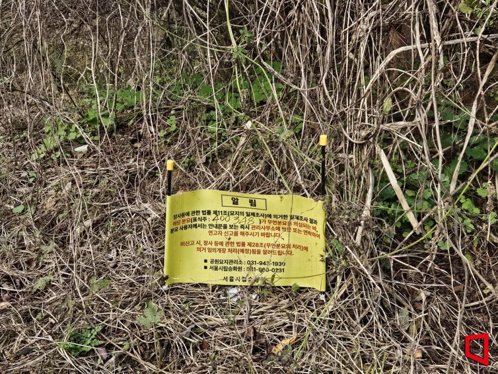 지난 10월24일 오전 경기도 파주시 광탄면에 위치 서울시립 용미리 제1공원묘지. 우거진 잡초와 수풀 사이 '무연분묘로 의심되는바 연고자께선 신고해주시길 바란다'고 쓰인 노란색 안내 팻말이 꽂혀 있었다. 팻말 뒤쪽 묘지에는 나무가 뿌리를 내려 본래 형태조차 알아보기 힘들었다. 나뭇가지를 걷어내자 그제야 봉분의 흔적이 희미하게 드러났다. 수풀을 헤치고 올라간 다른 길목도 사정은 마찬가지였다. 팻말 뒤편에 있어야 할 봉분은 거의 무너져 내렸고, 묘가 있었던 자리임을 알리는 낡은 상석만이 덩그러니 남아 있었다.
