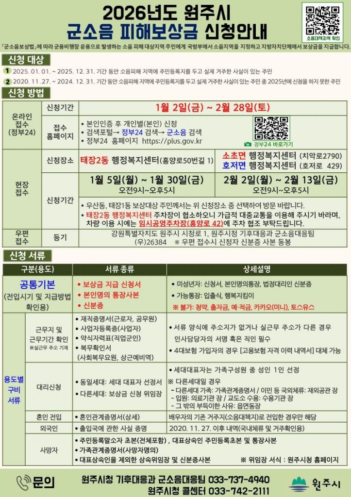강원도 원주시는 내년 1월부터 2월까지 '2026년 군소음 피해보상금' 신청을 접수한다.
