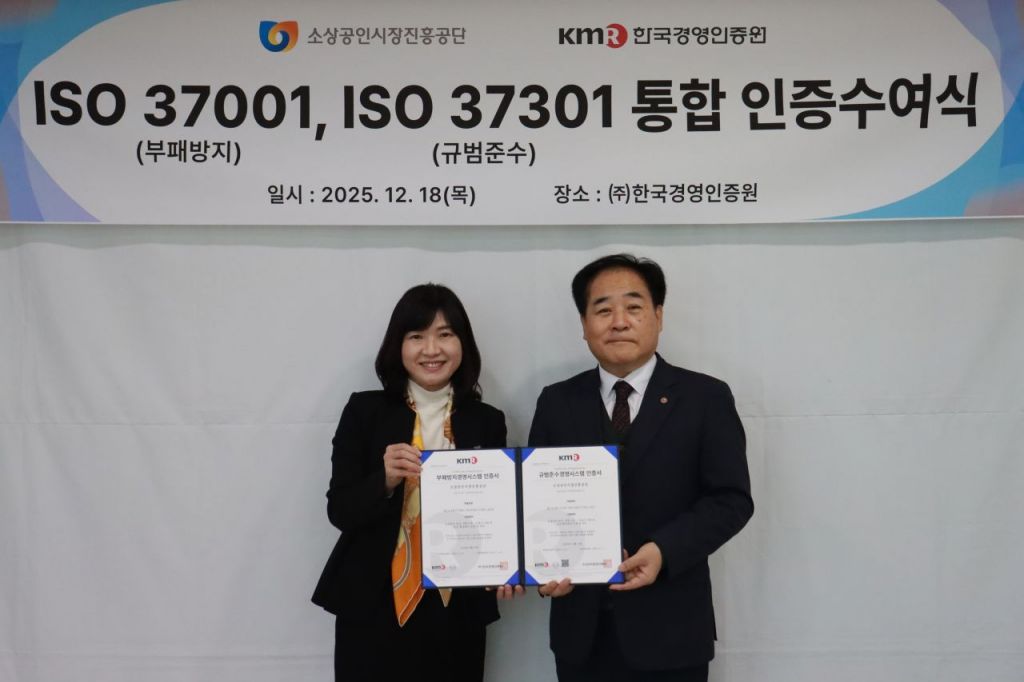 소상공인시장진흥공단은 국제표준화기구(ISO) 인증기관인 한국경영인증원(KMR)으로부터 부패방지경영시스템(ISO 37001)과 규범준수경영시스템(ISO 37301)에 대한 통합인증을 취득했다고 19일 밝혔다.
