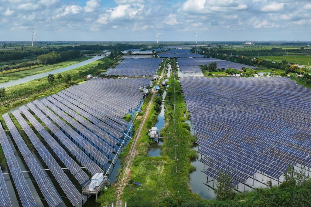 중국 동부 장쑤성 화이안시 진후현의 연못 위에 태양광 패널이 설치된 모습. AFP연합뉴스