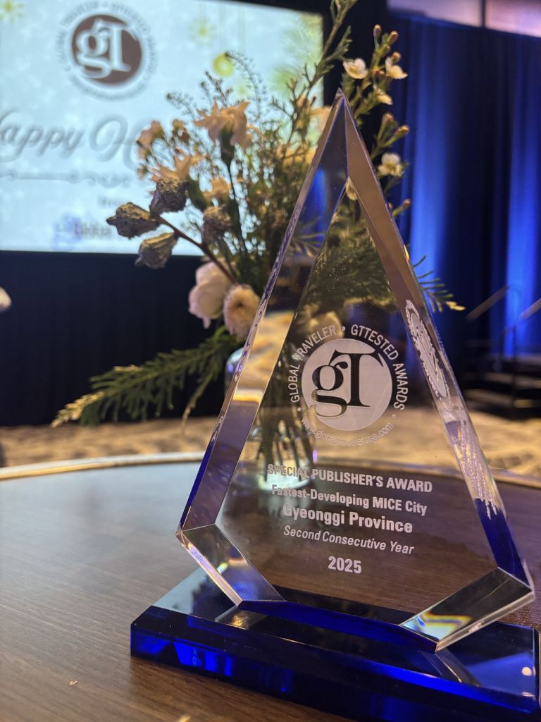 경기관광공사가 지난 17일(현지시간) 미국 플로리다주 마이애미에서 열린 '글로벌 트래블러 테스티드 어워즈(GT Tested Reader Survey Awards 2025)'에서 2년 연속 '가장 빠르게 발전하는 마이스도시(Fastest Developing MICE City)'상을 받았다.