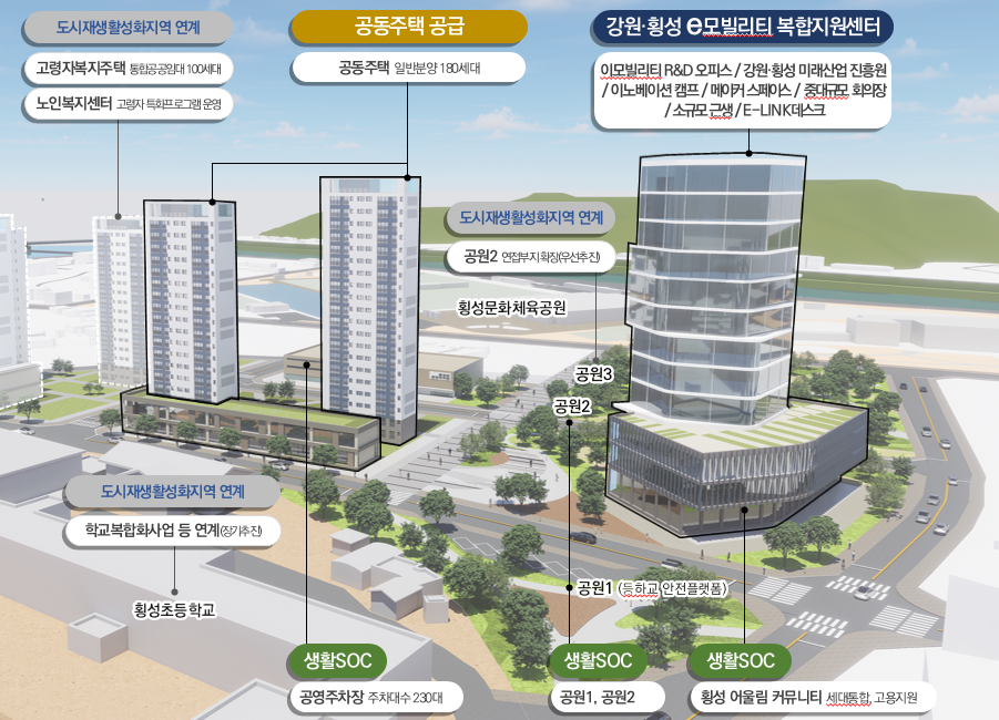 주요 사업 내용은 ▲이모빌리티 배후 거점 조성 : 연구센터, 비즈니스 지원시설 등 산업 인프라 구축 ▲청년 중심 주거·문화 공간 : 청년 창업지원 주택 및 복합 문화시설 건립 ▲스마트 교통 네트워크 : 자율주행 셔틀 및 스마트 주차 시스템 도입 등이다.