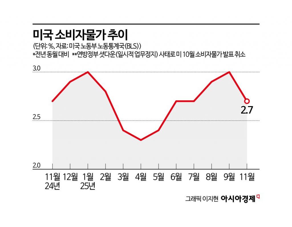 미 노동통계국(BLS)이 18일(현지시간) 발표한 11월 소비자물가지수(CPI)는 전년 동월 대비 2.7% 상승해 다우존스가 집계한 전문가 예상치(3.1%)를 밑돌았다. 이는 2021년 3월 이후 가장 낮은 수준이다. 변동성이 큰 식료품과 에너지를 제외한 근원 CPI도 전년 동월 대비 2.6% 상승해 9월(3.0%)보다 상승 폭이 둔화됐다.