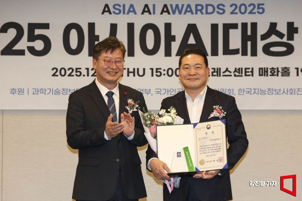 최은수 인텔리빅스 대표(오른쪽)가 18일 서울 중구 프레스센터 매화홀에서 열린 '제3회 아시아AI대상 시상식'에서 중소벤처기업부 장관상을 수상하고 있다. 2025.12.18 강진형 기자