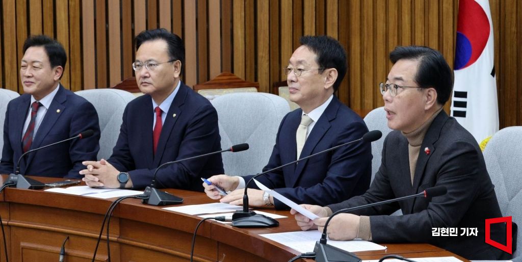 송언석 국민의힘 원내대표가 19일 국회에서 열린 원내대책회의에서 발언하고 있다.