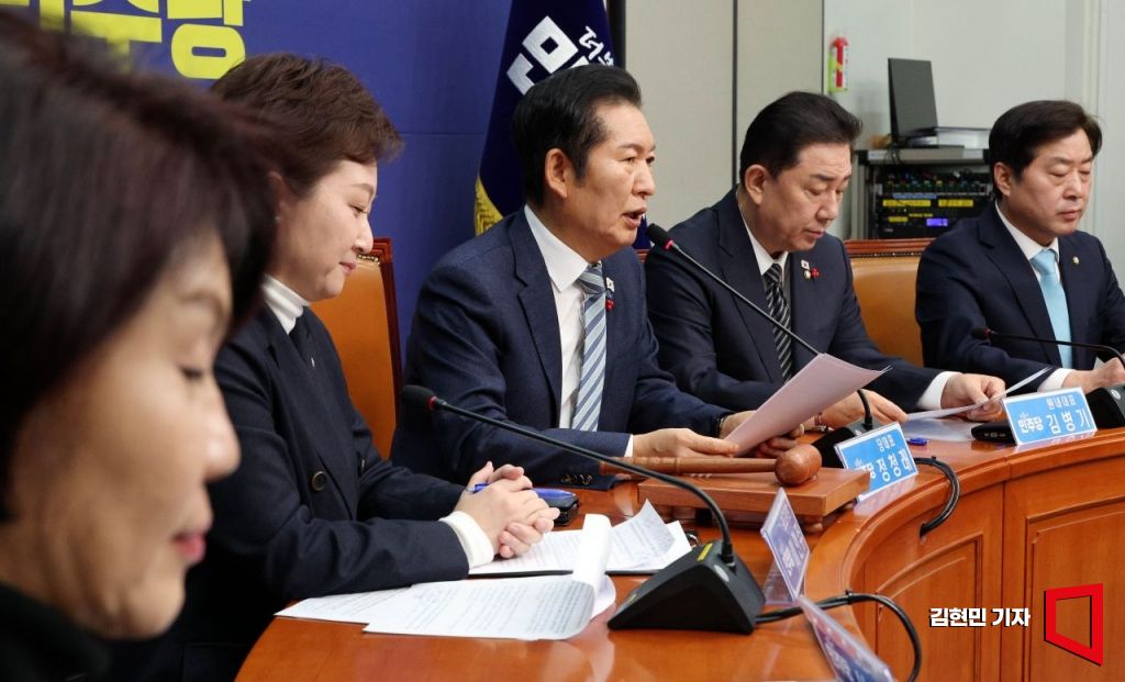 정청래 더불어민주당 대표가 19일 국회에서 열린 최고위원회의에서 발언하고 있다.