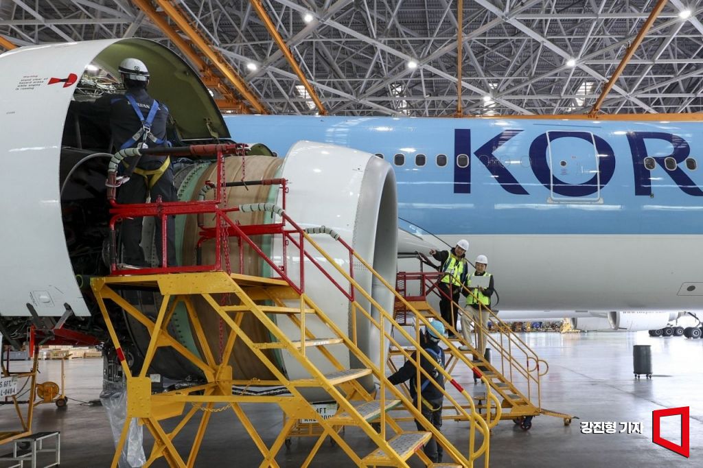 9일 인천 중구 대한항공정비고에서 대한항공 예지정비 엔지니어와 정비사가 A330항공기 엔진 흡입구에 장착된 온도 센서를 점검하고 있다. 강진형 기자