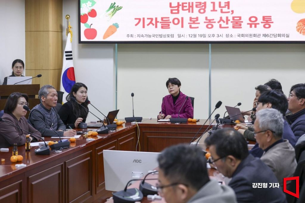 아시아경제 박재현 기자가 19일 서울 여의도 국회의원회관 제6간담회실에서 열린 '남태령 1년, 기자들이 본 농산물 유통'에서 취재 후기를 공유하고 있다.